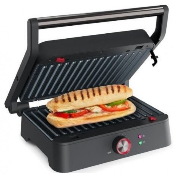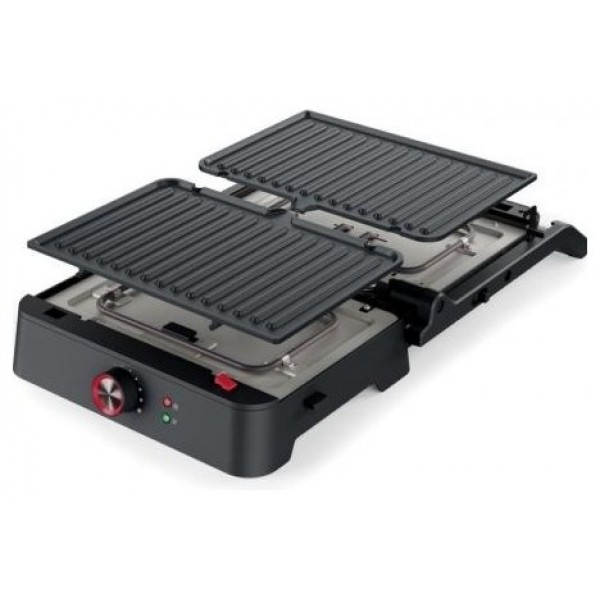 Placas desmontables - Abertura de 180ºTiene una superficie de cocción de 27,5 x 18 cm, termostato regulable y, gracias a su apertura de 180º, también puede utilizarse como parrilla de mesa. Al ser desmontables las placas, su limpieza después del uso es muy fácil. 1800 vatios de potencia.