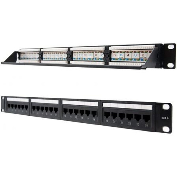 - 1 x Panel de parcheo de 24 puertos rj45 cat.6 utp, 19" 1u dual idc, negro