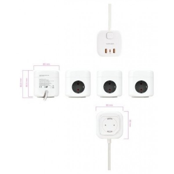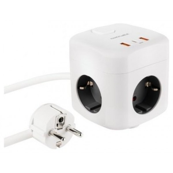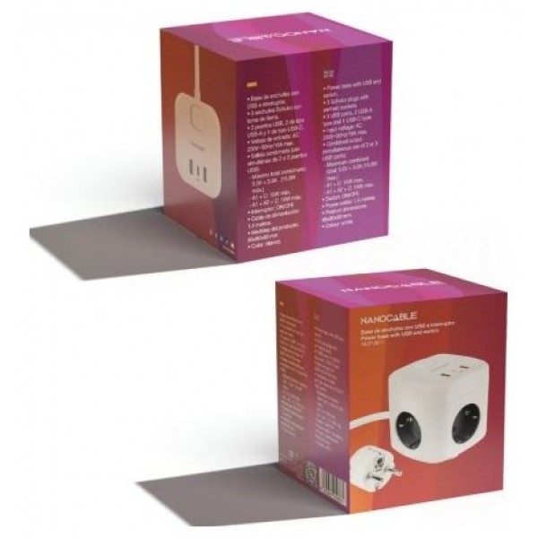 Regleta compacta en formato cubo con 3 enchufes de 16A y 3 puertos USB (2x USB-A + 1x USB-C).