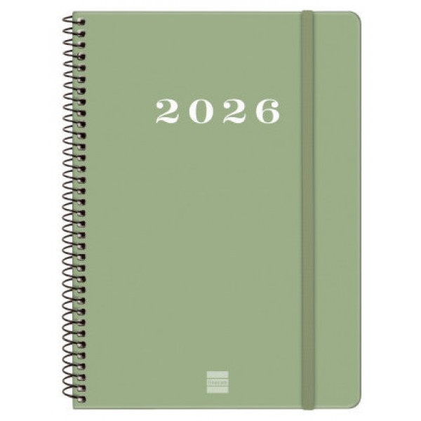 Agenda de espiral de estilo moderno y universal con tapa dura de cartón forrado con peliculado mate antirrayaduras. Ideal para uso personal y/o profesional. Con goma elástica. Esquinas microperforadas para localizar rápidamente el día/semana en curso. Contiene información de interés en la anualidad y otros contenidos extra. Formato similar a DIN A5 con las ventajas de una agenda portable y una de sobremesa. Duración: Enero 2026 - Diciembre 2026 (12 meses). Interior: Semana Vista Horizontal. Visión de la semana completa en horizontal que permite la escritura natural. Con espacio para concretar horario. Con información de los festivos de España. La anualidad de la agenda incluye la información relativa a: onomástica, festivos nacionales, cambios de estación e inicios de los años nuevos chino, musulmán, ortodoxo y hebreo. La agenda dispone también de otros contenidos extra: datos personales, horarios, calendarios, planificación anual del año y del año siguiente, festivos internacionales, cómo buscar en Google, usos del teclado, mapa de Europa y de los husos horarios, hojas para notas y hojas para teléfonos, direcciones y e-mails. Idioma del artículo: español. Formato: E10 - 155x212 mm. Tapas de cartón forrado con peliculado mate antirrayaduras, espiral simple metálica y papel. 80 g/m². Papel FSC®.