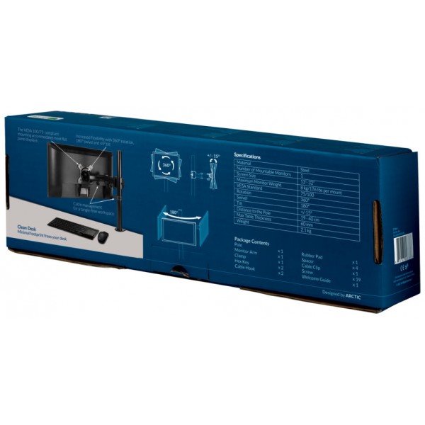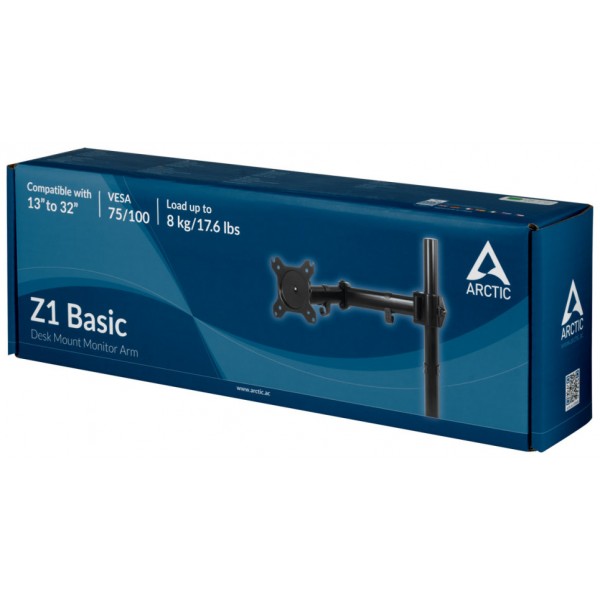 ARCTIC Z1 Basic. Montaje: Abrazadera, Adecuado para: Monitor de ordenador, Capacidad máxima de peso: 8 kg, Tamaño mínimo de pantalla: 33 cm (13"), Tamaño máximo de pantalla: 81,3 cm (32"), Compatibilidad con interfaz de montaje (min): 75 x 75 mm, Compatibilidad con interfaz de montaje (max): 100 x 100 mm. Ángulo de inclinación: -15 - 15°. Color del producto: Negro