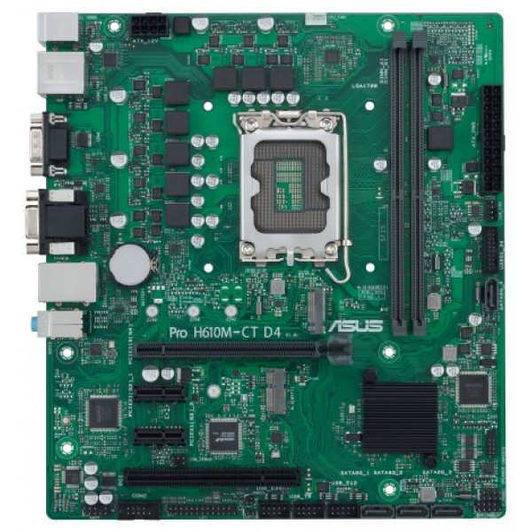 ASUS PRO H610M-CT D4-CSM. Fabricante de procesador: Intel, Socket de procesador: LGA 1700, Procesador compatible: Intel® Celeron®, Intel® Core™ i3, Intel® Core™ i5, Intel® Core™ i7, Intel® Core™ i9,.... tipos de memoria compatibles: DDR4-SDRAM, Memoria interna máxima: 64 GB, Tipo de ranuras de memoria: DIMM. Interfaces de disco de almacenamiento soportados: M.2, SATA III, Tipos de unidades de almacenamiento admitidas: HDD & SSD. Tipo de interfaz ethernet: Gigabit Ethernet. Componente para: PC, Factor de forma: micro ATX, Familia del chipset: Intel