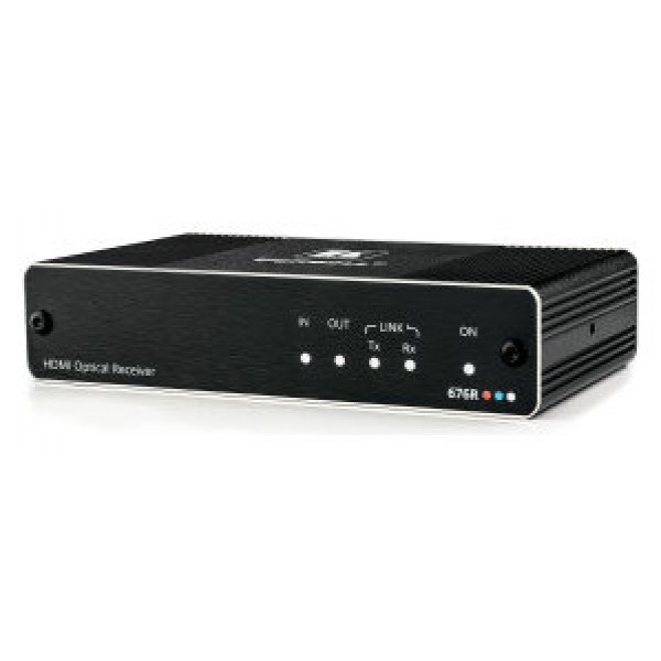 676R es un receptor de fibra HDMI de alto rendimiento para una extensión de ultra alcance de señales HDMI 4K a 60Hz (4: 4: 4). El 676R recibe la señal óptica transmitida de un transmisor compatible y la convierte en señales HDMI y RS−232. El 676R incluye un transceptor SFP + multimodo, pero se puede utilizar con cualquier transceptor SFP + certificado de Kramer, como un transceptor SFP + monomodo.