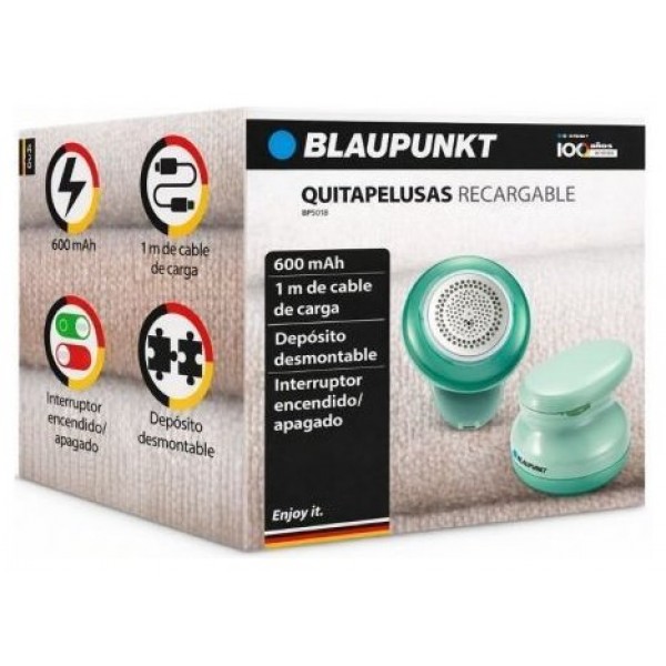 Blaupunkt BP5018 es un quitapelusas recargable para ropa y tapiceríascon depósito desmontable, tapa protectora, interruptor ON/OFF ypuerto de carga USB. Funciona con batería Ni-MH de 2,4 V (2×600mAh) e incluye cable de carga de 1 m para un uso cómodo y continuoen el hogar.