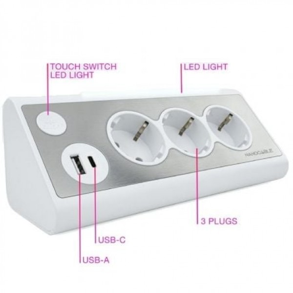 Especificación:. . 3 tomas de corriente con toma de tierra. 2 puertos USB de carga (USB-C y USB-A). USB-A: 5V/3A, 15W. 9V/2A, 18W. 12V/1.5A, 18W.. USB-C: 5V/3A, 15W. 15V/2A, 18W. 12V/1.5A, 18W.. USB-A + USB-C: 5V/3A, 15W.. Iluminación led con interruptor. Cable de 1.5 m. Protección infantil. Voltaje: 230V-50Hz. Certificado CE, ROSH, GS y REACH. Medidas del producto: 200x70x70 mm