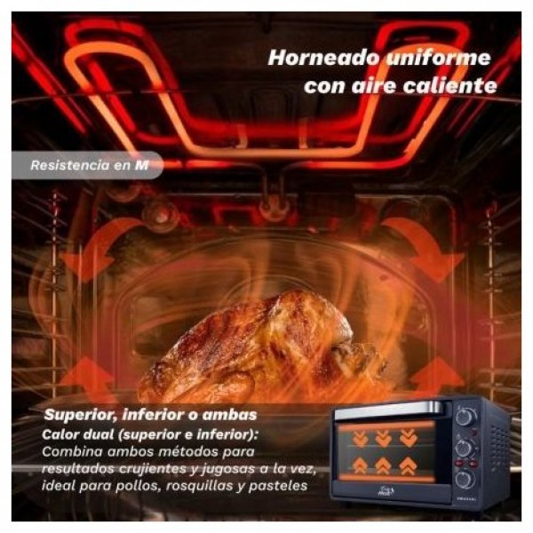 El horno eléctrico de GRUNKEL HR-28COOK es perfecto para quienes buscan rendimiento, versatilidad y eficiencia en su cocina. Con 1600W de potencia y capacidad de 28 litros, permite preparar desde carnes y pescados hasta pasteles. Su resistencia superior en M y el sistema de convección con botón independiente garantizan una cocción más rápida, uniforme y eficiente. Dispone de 3 modos de calor (superior, inferior y combinado), temperatura regulable hasta 230°C y temporizador mecánico de hasta 60 minutos con aviso acústico. Incluye una luz interior activable para vigilar el proceso sin abrir la puerta. El diseño robusto cuenta con tirador de seguridad de tacto frío y acabados en acero inoxidable que aportan durabilidad y estilo. Se entrega con bandeja, parrilla y asa extractora. El horno GRUNKEL HR-28COOK es una solución completa para cocinar como un chef, incluso en espacios compactos.Especificaciones