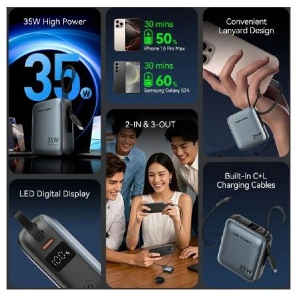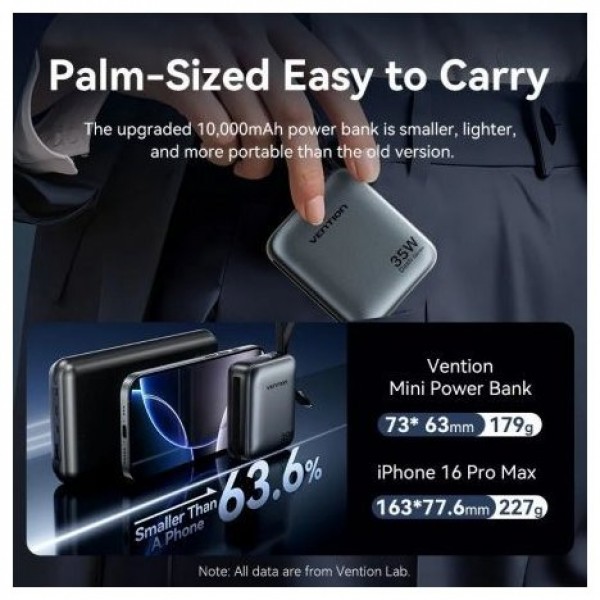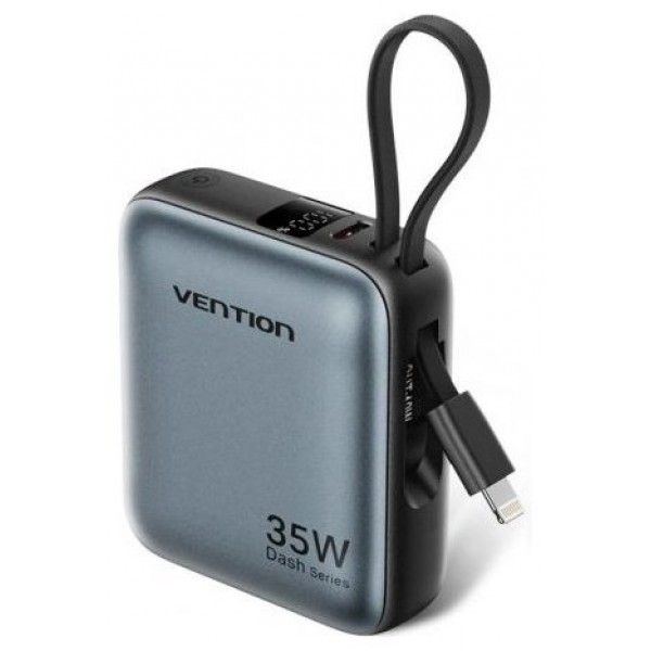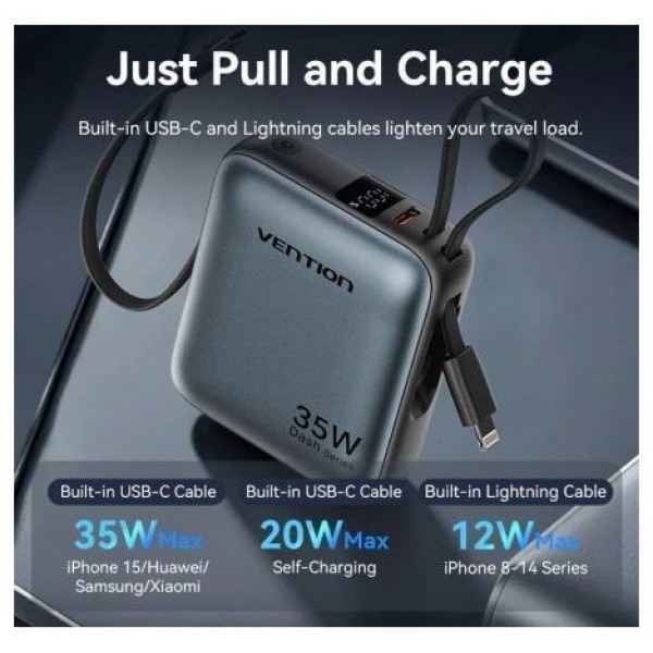 Vention Mini banco de energía de 10000 mAh (USB-C + USB-C/Lightning) con cables USB-C y Lightning integrados, 35 W, gris