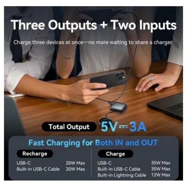 - Salida (cable USB-C integrado): 5V⎓3A; 9V⎓3A; 12V⎓2.92A; 15V⎓2.33A; 20V⎓1.75A (35W Máx)