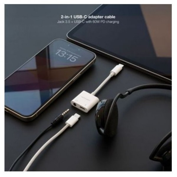 - 1 x Adaptador de Audio USB-C/M a Jack 3.5/H + USB-C/H PD 60W, 11.5 cm, Blanco