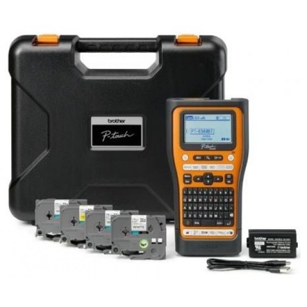- Máquina PT-E560BT, batería recargable de ion litio, cable USB Tipo-C (1m, negro), 1x cinta laminada súper adhesiva de18mm negro sobre blanco/ 1x cinta laminada súper adhesiva de 24mm negro sobre blanca/1x cinta laminada súper adhesiva de 24mm negro sobre fondo amarillo/1x cinta laminada flexible de 12mm negro sobre fondo blanco; documentación, maletín de transporte