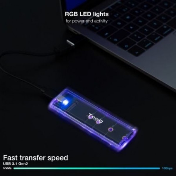 ¡Nuestra caja externa se desnuda para que puedas ver todos sus circuitos funcionando!. Guarda tus juegos, partidas, o cualquier otro dato, lucirán espectaculares en nuestra caja externa para SSD M.2 NGFF/NVME. ¡Además tiene luz led RGB!. . Especificaciones:. . Conexión USB-C (USB 3.1 Gen2 10Gbps). Apertura fácil, sin tornillos. Incluye led de encendido/actividad. Leds RGB. Compatible con M.2 NGFF y NVMe PCIe 2230/2242/2260/2280. Soporta SSD de hasta 2 TB. Compatible con Windows, MacOS y distribuciones Linux. Incluye 2 cables: USB-C a USB-C y USB-C a USB-A. Color: N/A. Material: ABS. Medidas del producto: 104x32x11 mm. Peso neto: 27 gr. Peso bruto: 220 gr.. Medidas del embalaje: 115x90x35 mm