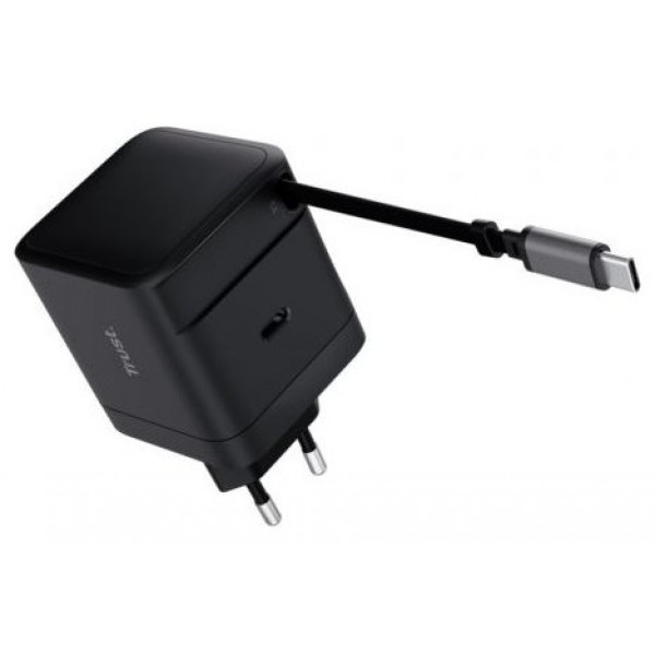 CARGADOR PARED/VIAJE USB-C 65W + CABLE USB-C RETRACTIL MAXO NEGRO TRUST (Espera 4 dias)